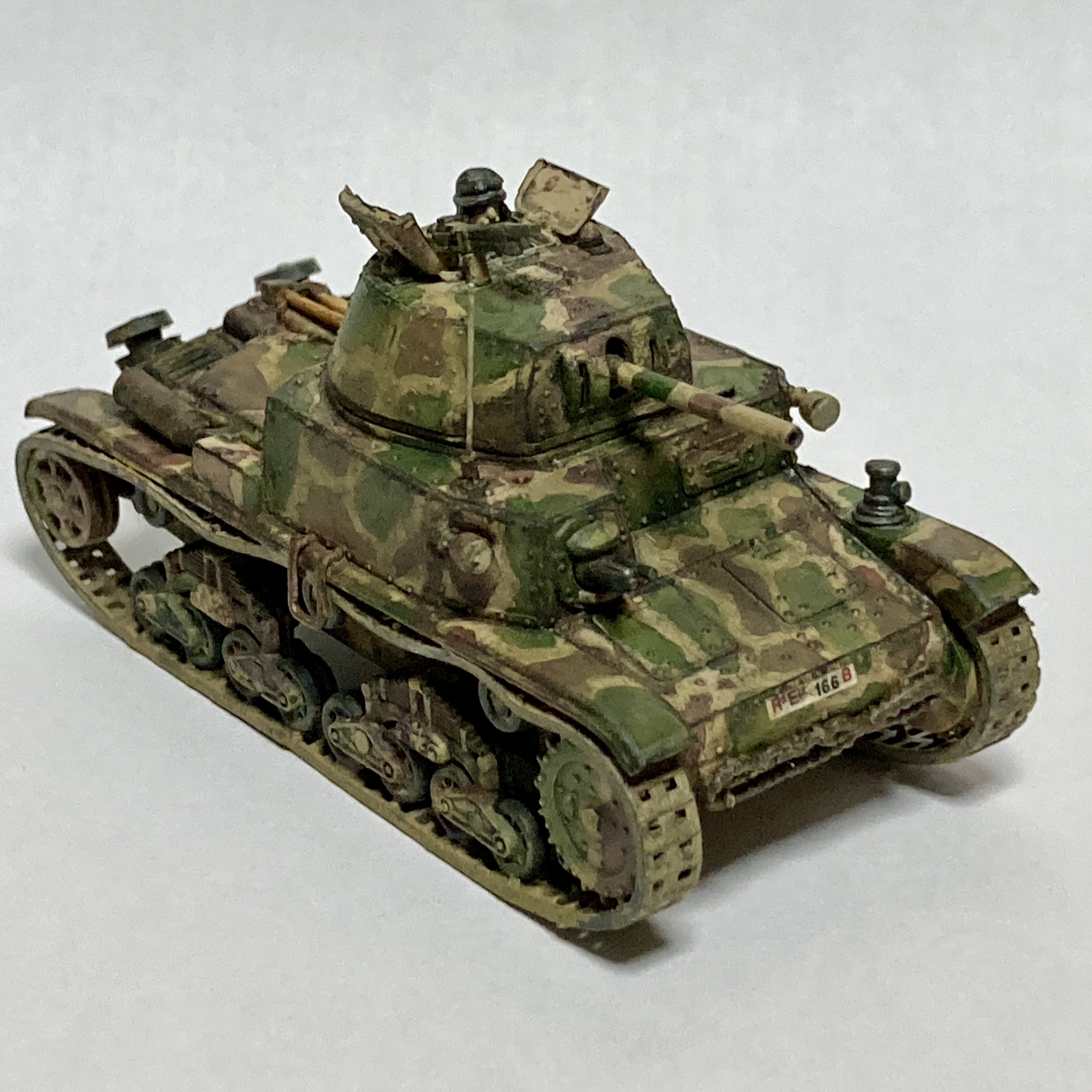 変化が欲しかったので、塗装はバフ、フラットグリーン、フラットブラウンの3色迷彩。でもこのパターンはイタリア軍ではなく、ドイツ軍のもののようだ。 |